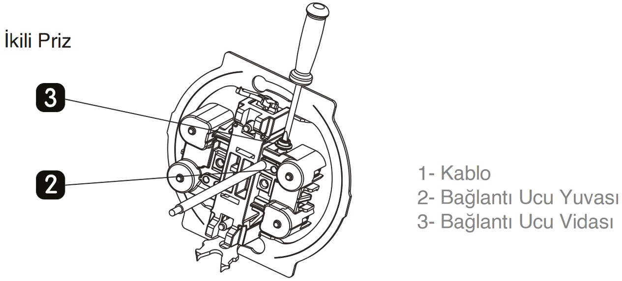 Kablo boyu (1), iletken kısmı açıkta kalmayacak şekilde 8-9 mm açılarak, iletken kısmı bağlantı ucu noktasına (2), bağlantı ucu vidası (3) gevşetilerek yerleştirilir. Kablo, bağlantı ucu yuvasına (2) yerleştirildikten sonra, bağlantı ucu vidası sıkılarak (3) kablo montajı tamamlanır. Kabloyu hareket ettirerek sıkı bir şekilde yerine yerleştiğinden emin oluruz.